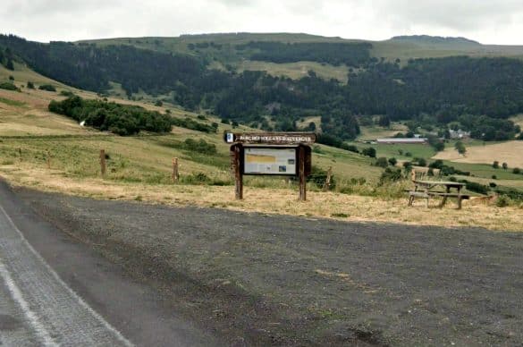 2 – Quitter le chemin pour franchir à droite un escabeau. A travers les pâturages, suivre à main droite la clôture qui surplombe le cirque . Franchir un nouvel escabeau et immédiatement bifurquer à gauche en suivant la clôture. Après un troisième escabeau, aller en face jusqu’à la lisière du bois. La suivre à gauche, sur environ 750 m ( panorama sur les monts du Cantal, le Sancy et la chaîne des Dôme). A une intersection, bifurquer à gauche en suivant une clôture pour rejoindre un large chemin carrossable.